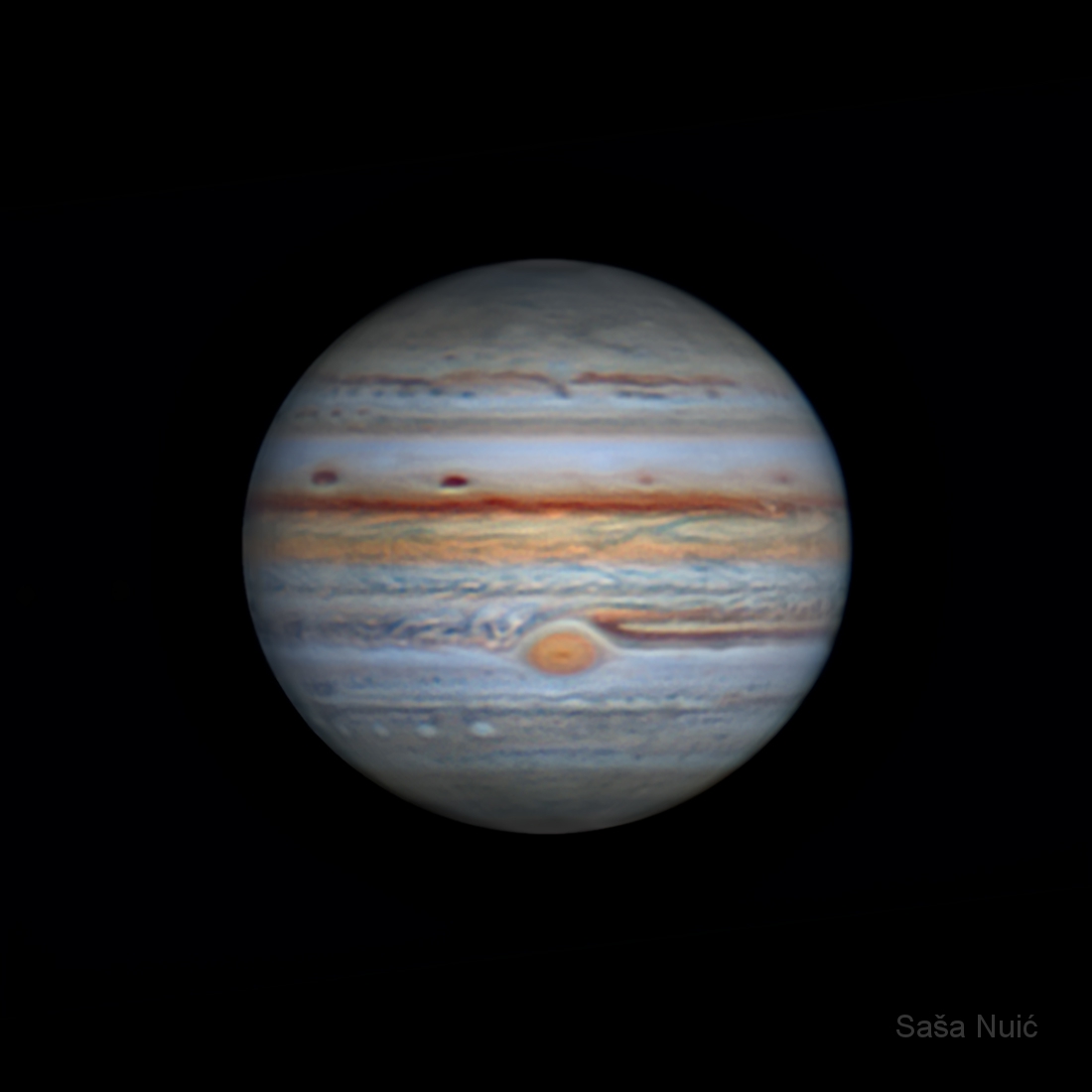Ovaj Saturn, a i i Jupiter su najbolje što sam do sada snimio u planetarnoj astrofotografiji. Detalji koje je donijela visina Biokova i stabilna atmosfera su nevjerojatni. Jupiterova pjega mi je bila okrenuta te noći, a lijepo se vidi i struktura unutar pjege. Nije ona tu slučajno – nastala je na mjestu susreta tamnih pojasa i svijetlijih zona koje se kreću u suprotnim smjerovima. Nije to ništa neobično. I na zemlji imamo sličnu pojavu u atmosferi do kojih dolazi zbog Coriolisove sile. Pa tako oko ekvatora imamo vjetrove koji pušu u smjeru zapada, a prema obratnicama vjetrove koji pušu u smjeru istoka. Svijetlije zone su specifične i po tome što su nekih 20tak km uzdignutije od pojaseva. A bijele su zbog kristalića amonijaka. Tako su tamna mjesta više uvid u nešto dublju jupiterovu atmosferu.