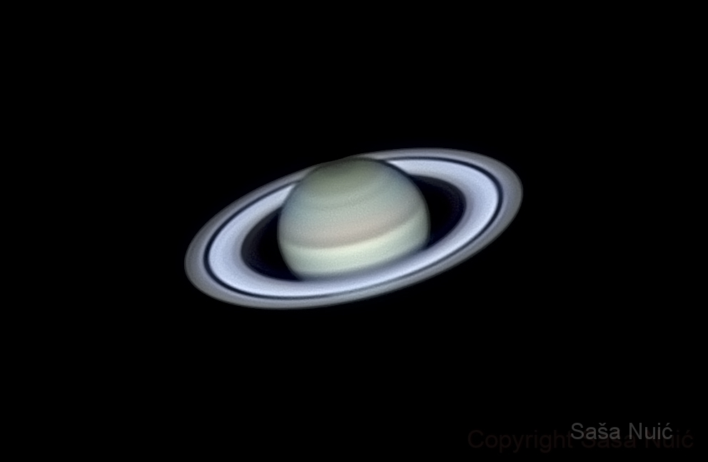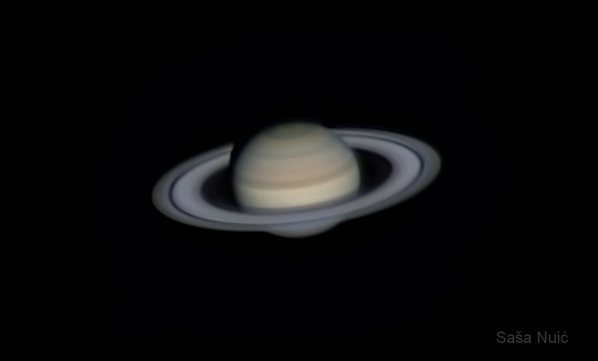 Usporedimo li Saturn sada i onaj kojeg sam 2017. snimio s Lastova jasno se vidi razlika u nagetosti prstena. Razlog je tome što su prsten i os rotacije Saturna pod nagibomi u odnosu na putanju njegove rotacije oko Sunca. Tako nam Saturn tijekom 29-godišnje rotacije oko Sunca u jednom dijelu pokazuje svoj sjeverni pol, pa nakon 14tak godina južni pol. Naravno, u jednom trenutku Zemlja će se nalaziti točno u ravnini rotacije prstena i prsten će prema nama postati samo jedna izuzetno tanana crta, na granici nestajanja. Zašto tanana – jer je širok svega nekoliko kilometara, a na mjestima i svega nekoliko stotina metara. Slijedeći put nas takva prsten crta čeka 23.03.2025. To treba loviti!